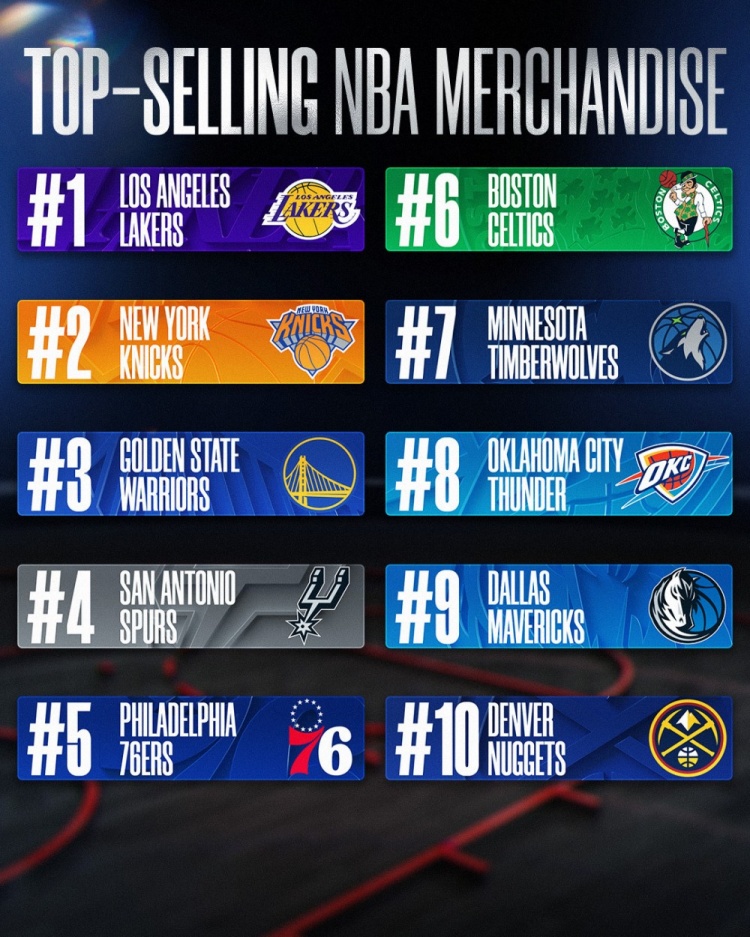 1月21日讯 NBA官方公布了25-26赛季上半赛季球队球衣销量排行,该数据均基于NBAStore的销售数据。