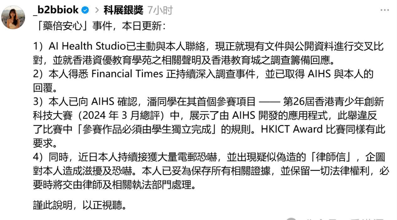 就在大家以为又一个“别人家的孩子”的神话诞生时,一位名叫郑曦琳(Hailey)的城大女生在社交平台Threads上轻轻问了一句:“这事好像不太对劲吧。”其潜台词是:大家真的相信一个中四学生能独自搞定一个技术复杂、涉及大量医疗数据的商业级AI平台吗?这牛皮吹得也太大了,当我们傻吗?