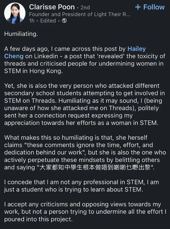 前言不搭后语:事件曝光后,AI Health Studio的网站迅速修改了措辞,将“开发项目”改为“协助改善”,试图将自己从“从无到有”的创造者变成“锦上添花”的优化者。潘浠淳自己在领英上发帖,指责网民恶意中伤香港STEM女性,但随后又删除帖子。这种“此地无银三百两”的操作,无疑是自掘坟墓。