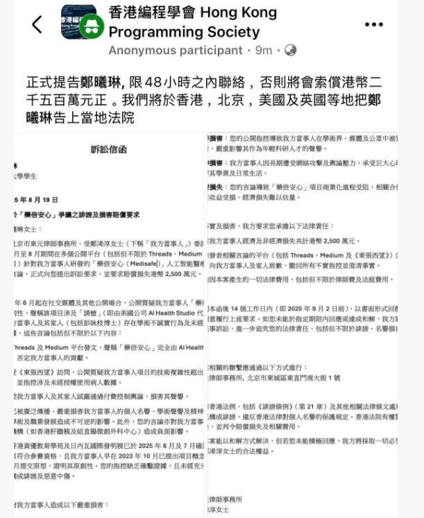 最离谱的是,她还收到一封声称来自“北京市东元律师事务所”(后被网民查出该律所已注销)的假律师信,代表“郑浠淳女士”(连名字都搞错),要求她赔偿2500万港币。这些人简直把全世界都当傻子了。